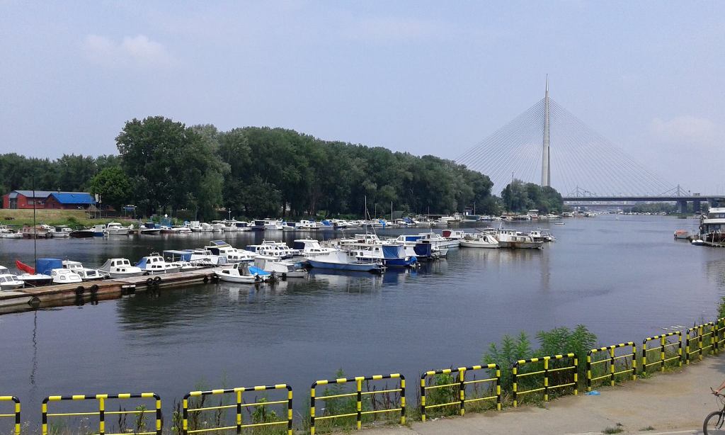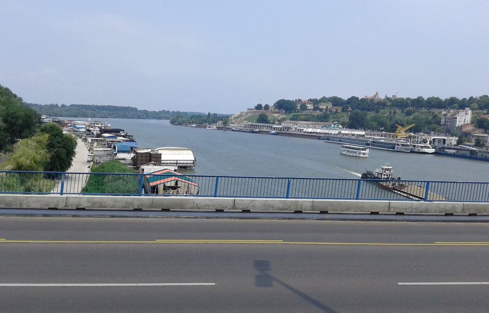 Το λιμάνι της πόλης, στα πόδια του κάστρου Kalemegdan, όπως φαίνεται καθώς διασχίζουμε την γέφυρα Brankov Most. Δεξιά η διεθνής αποβάθρα επιβατών και αριστερά η αποβάθρα για τα πλωτά bars και clubs.