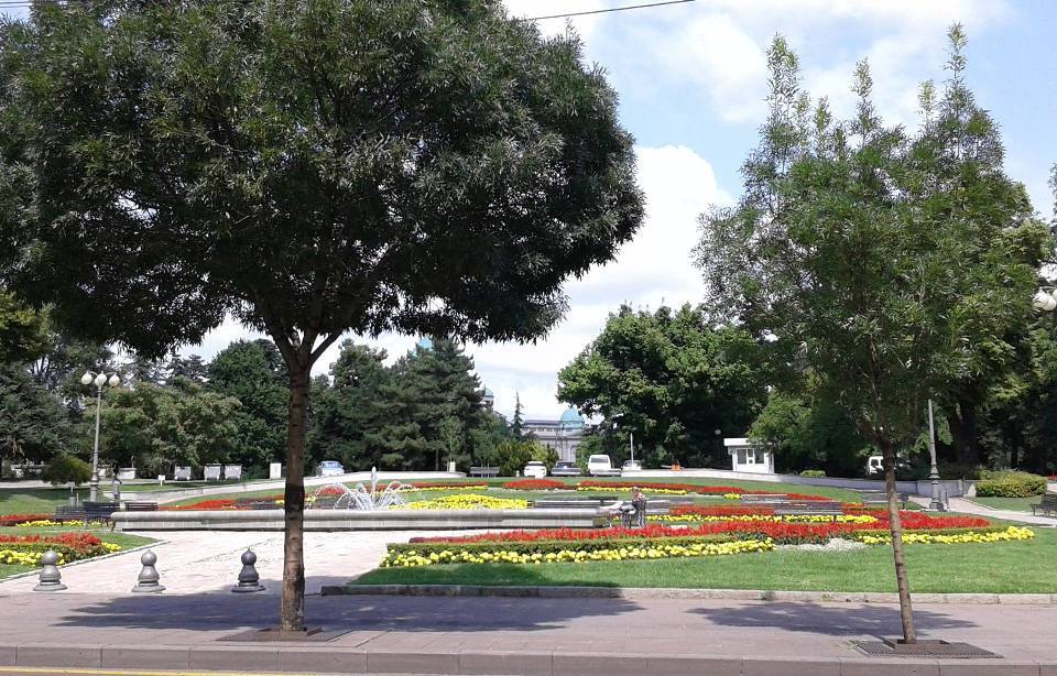 Το Pionirski Park περικλείεται από τα πλέον εμβληματικά κτήρια της πόλης. Στο βάθος διακρίνεται το κτήριο του Κοινοβουλίου, αριστερά βρίσκεται το Δημαρχείο της πόλης.