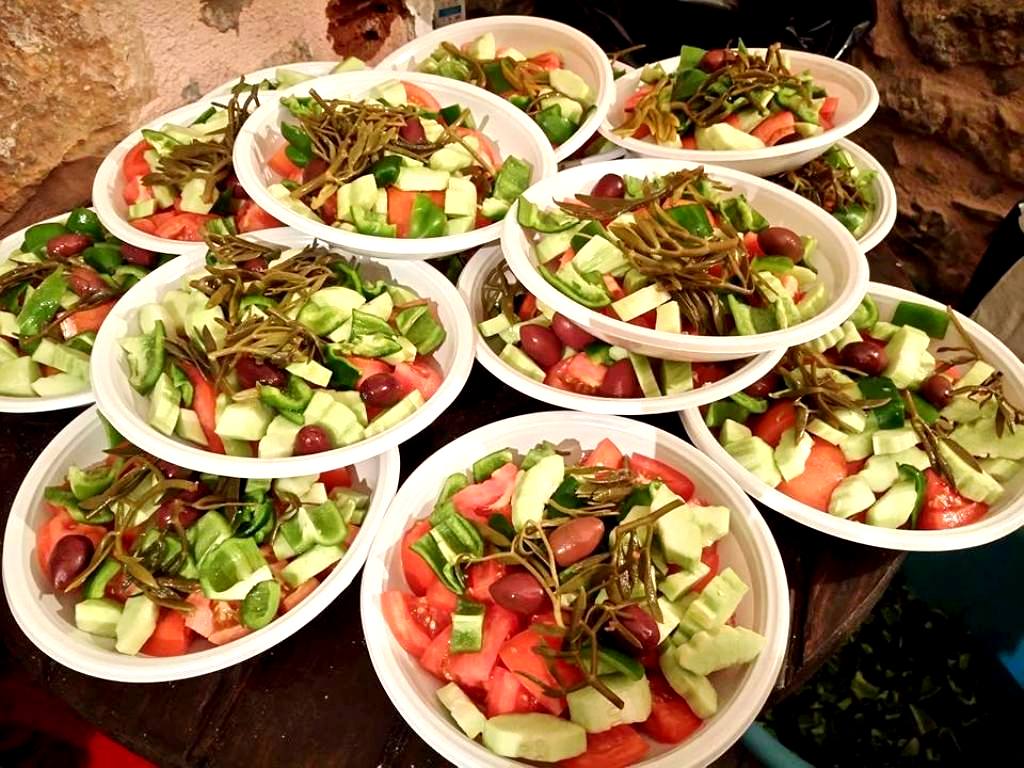 Η γυναικεία ομάδα εθελοντριών, των «κοπιαστικών» όπως επίσης χαρακτηριστικά ονομάζονται, που ετοιμάζει τις σαλάτες και τα άλλα συνοδευτικά του φαγητού. Από αριστερά: Καλλιόπη Αυγουστίδη, Μαρίνα Αυγουστίδη, Σεβαστή Συρίμη και Ειρήνη Ζερβούδη.
