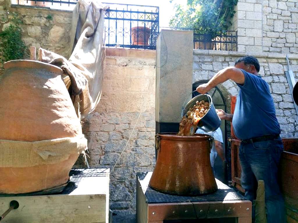 …και αρχίζει να ρέει σιγά-σιγά, ως αρωματική σούμα πλέον, στο δοχείο συλλογής, στην «μπουρνιά», σκεύος που στις παλαιότερες εποχές ήταν επίσης πήλινο.