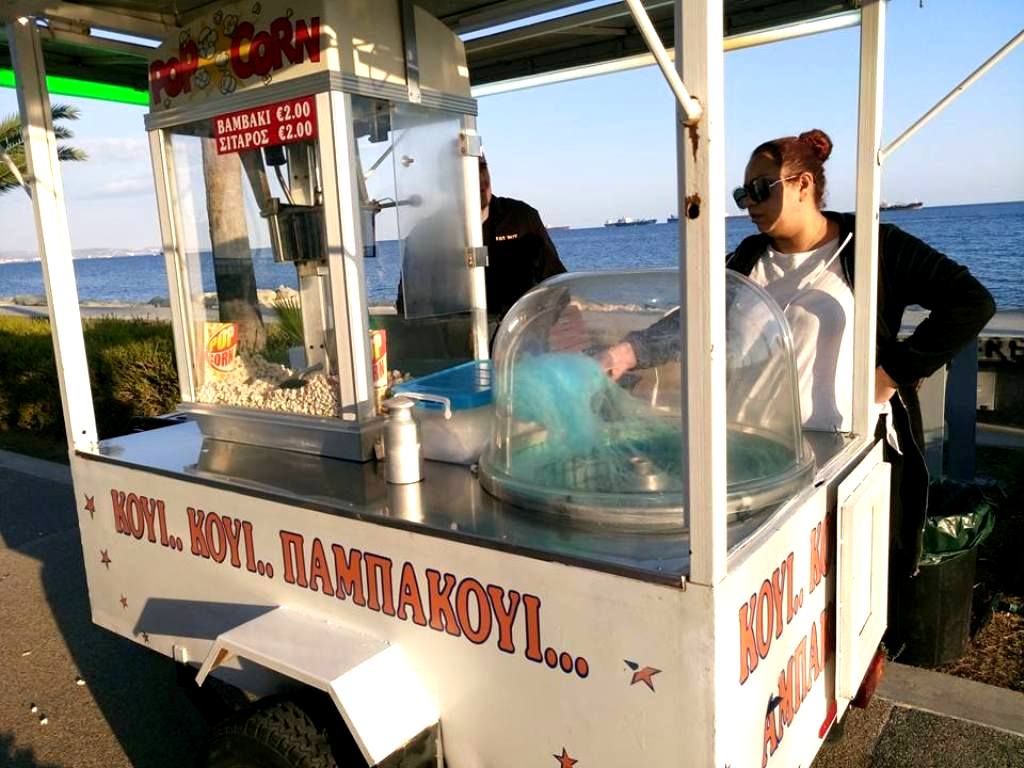 Εύηχα σλόγκαν συναντούμε γραμμένα σε αμαξάκια πλανόδιων πωλητών, όπως το «Κούι Κούι, Παμπακούι», από αυτόν τον πωλητή μαλλιού της γριάς, στην παραλία της Λεμεσού. «Στη σύγχρονη εποχή του πολλαπλασιασμού των υπεραγορών, των ζαχαροπλαστείων και των φούρνων, μπορεί το φαγητό του δρόμου να έχει μετατραπεί από αναγκαιότητα σε επιλογή, ωστόσο οι πωλητές φαγητού συνεχίζουν να κινούνται ανάμεσά μας, με ορισμένα από τα αμαξάκια και τα διαλαλήματά τους να μην διαφέρουν και πολύ από αυτά του παρελθόντος», αναφέρει χαρακτηριστικά η Χρυσταλλένη Λαζάρου, Πρόεδρος του Δ.Σ. του Μουσείου Κυπριακών Τροφίμων και Διατροφής.