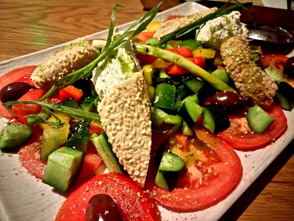 …μας προ(σ)καλούν να βουτήξουμε στα ζουμάκια της χωριάτικης, την οποία συναποτελούν πολύχρωμες ντομάτες και πιπεριές, αγγουράκι, ψημένο φρέσκο κρεμμυδάκι, ελιές, μους φέτας, κουλούρι Θεσσαλονίκης και φυσικά μπόλικο παρθένο ελαιόλαδο.