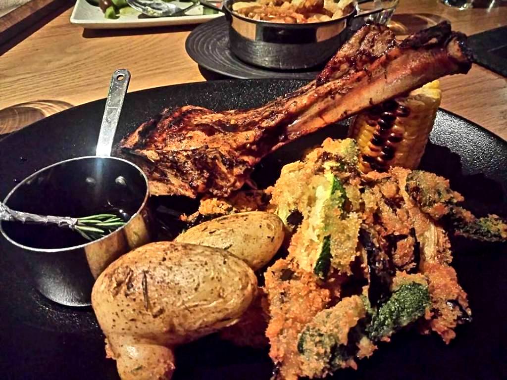 …ενώ η χοιρινή μπριζόλα, μαριναρισμένη σε μείγμα μπαχαρικών tandoori, συνοδευόταν από chips καλοκαιρινών λαχανικών και sauce κρασιού.
