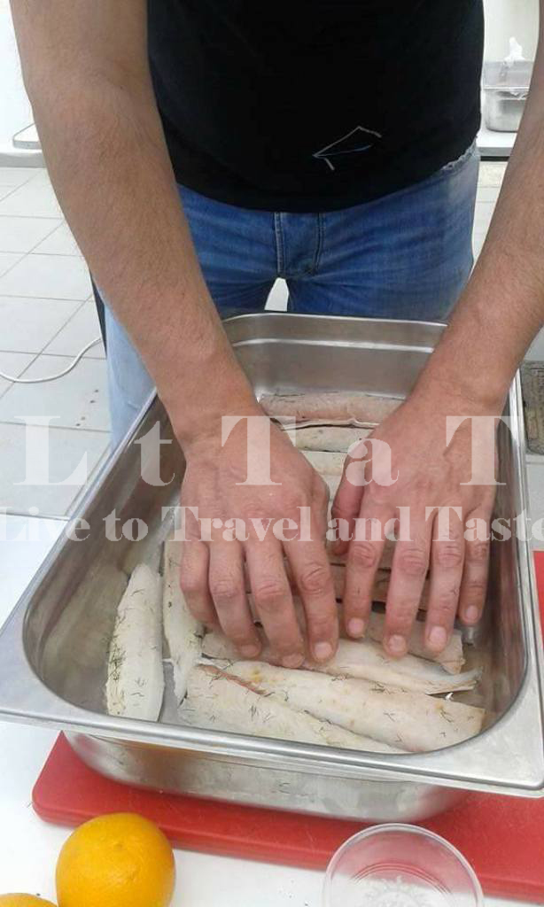 …μέσα στο οποίο θα τοποθετήσει στη συνέχεια τα φιλέτα μπακαλιάρου και θα τα πασπαλίσει με μάραθο. Συνεχίζει δημιουργώντας στρώσεις αλατιού-ζάχαρης, ψαριού και μάραθου.
