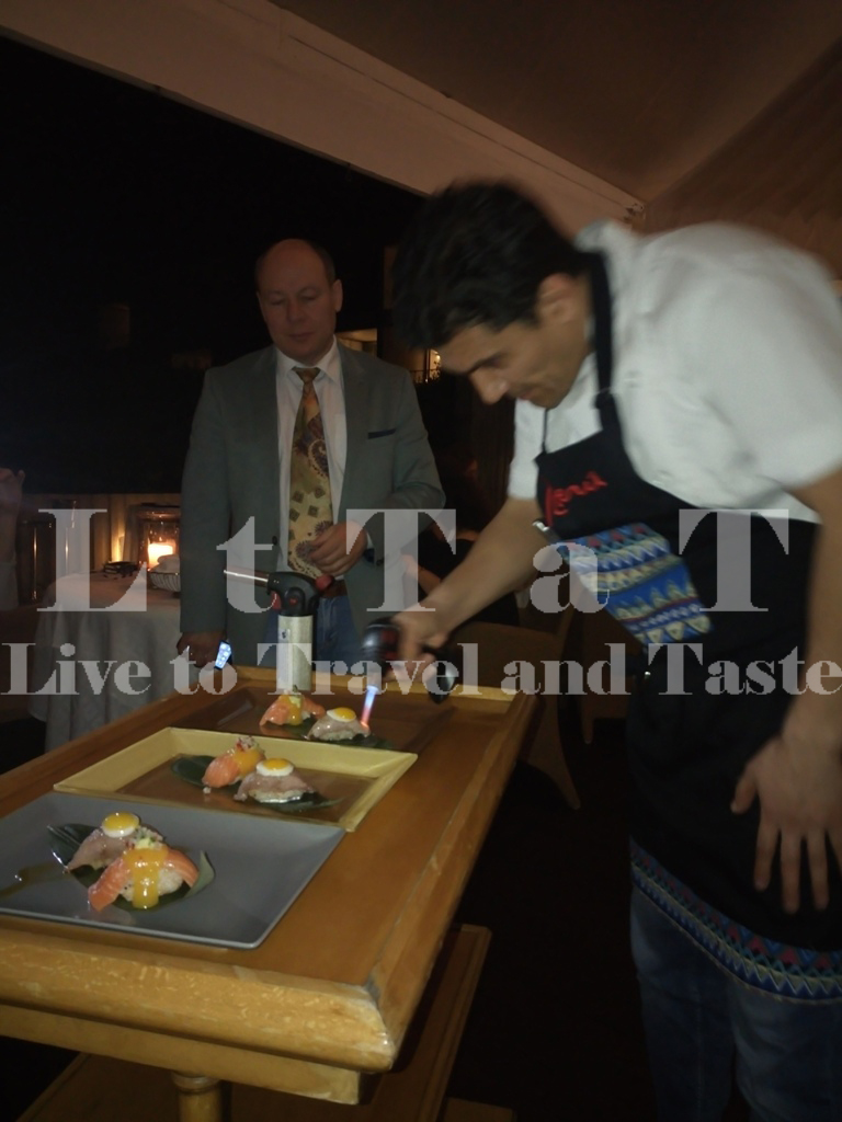 Ο chef Rashid Rakhmanov με το φλόγιστρό του βάζει την τελευταία πινελιά -υπό το βλέμμα του επίσης Ρώσου Leonid Gelibterman, Προέδρου του International Center of Wine and Gastronomy, αλλά και όλων ημών-…