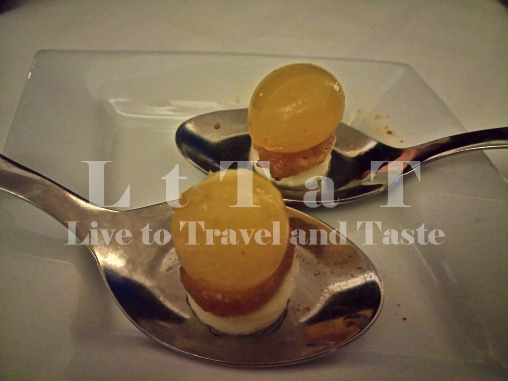 …στο τραπέζι μας φθάνει το κερκυραϊκής ταυτότητος amuse bouche: σφαιροποιημένο νεράντζι, με γραβιέρα Κερκύρας και mousse συκομαΐδας -τοπικό γλύκισμα σε σχήμα μπιφτεκιού, που παρασκευάζεται από ξερά σύκα ζυμωμένα με ούζο, μαστίχα, μούστο και μπόλικο πιπέρι.