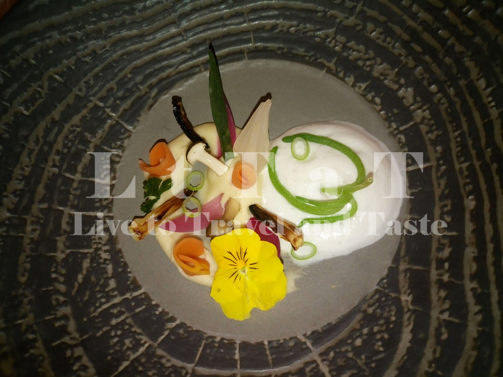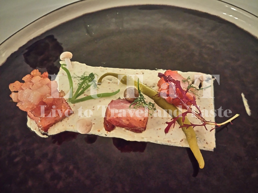 Εν αρχή ην… απεριτίφ, ποτά τα οποία ως γνωστόν, σερβίρονται πάντοτε πριν από το γεύμα, σκέτα ή με κάποιον μεζέ, με απώτερο σκοπό τους να μας ανοίξουν την όρεξη. Εδώ έχουμε ένα ουίσκι για τον Βασίλη, τον άνδρα της παρέας, ένα cocktail με λεμονάδα, rose syrup και φρούτα του πάθους για μένα και τέλος ένα cocktail με tonic water, orange bitter, βασιλικό και φρέσκο πράσινο λεμόνι, για την Alexandra, την υπεύθυνη Μarketing του ξενοδοχείου, η οποία αποτέλεσε την ιδανική σύντροφο και «ξεναγό» μας στα απάτητα γευστικά μονοπάτια ενός special δείπνου, που διήρκεσε πάνω από 4 ώρες!