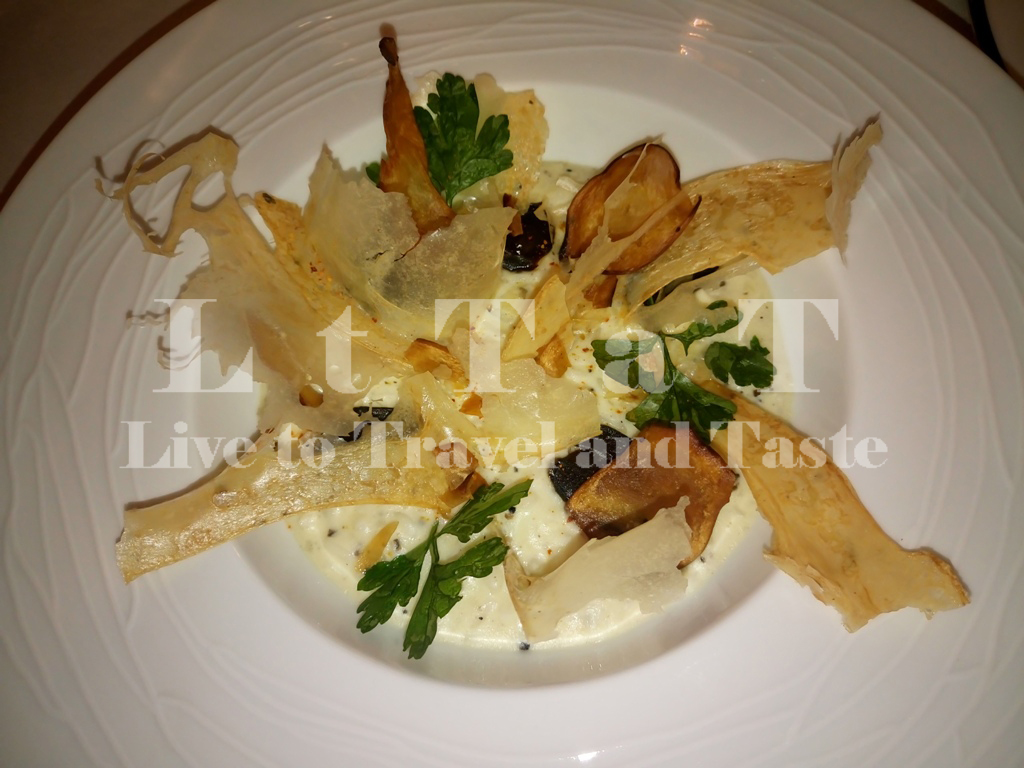 Japanese rice (μια χρονοβόρα διαδικασία μαγειρέματος του ρυζιού με πολύ νόστιμο αποτέλεσμα), με τρούφα, crispy rice και φουά γκρα.