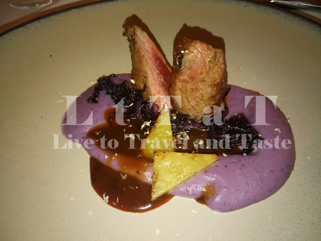 Ελάφι με πουρέ από πατάτες vitelottes, κόκκινο λάχανο και γογγύλι. Οι μικρόκαρπες πατάτες vitelottes είναι μια αρχαία ποικιλία καταγωγής από την Νότια Αμερική, με παχιά φλούδα και έντονο μπλε χρώμα, που τείνει προς το μωβ.