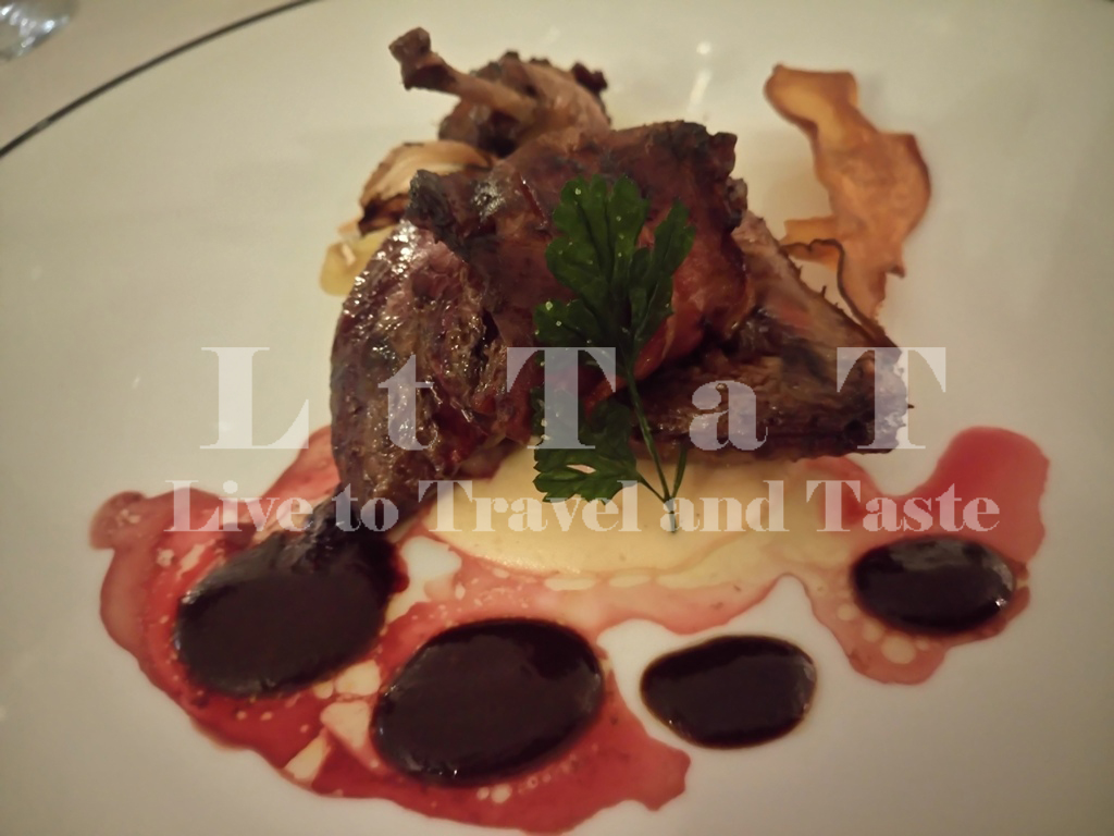 Κρέας περιστεριού, εντόσθια και λίγο χοιρινό, royal sauce με ζωμό περιστεριού, σάλτσα σοκολάτας, πουρές λευκών φασολιών και crispy rice.