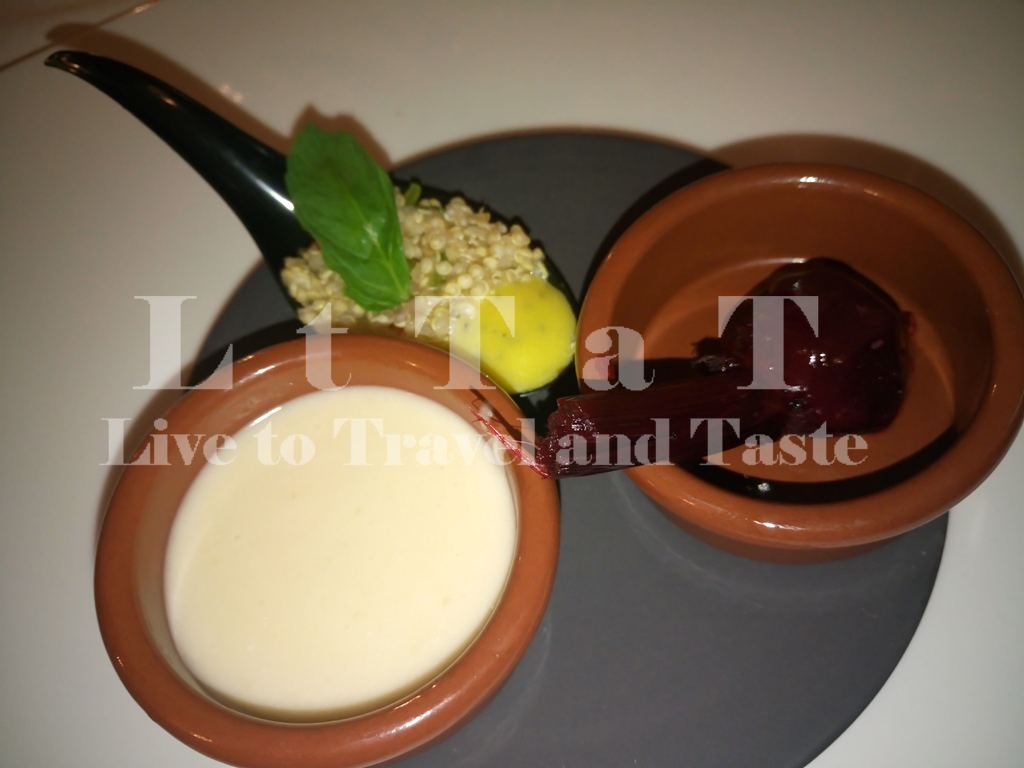 Amuse-bouche No 1: σαλάτα με κινόα, παγωμένο πατζάρι και πουρές από λευκά φασόλια Tarbais, τα οποία έχουν ήπια γεύση, λεπτή φλούδα και δεν χάνουν το σχήμα τους κατά το μαγείρεμα.