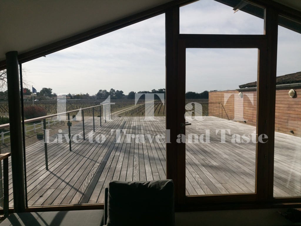 Ο χώρος δοκιμής των κρασιών και η μεγάλη βεράντα του με θέα προς τους αμπελώνες του κτήματος.