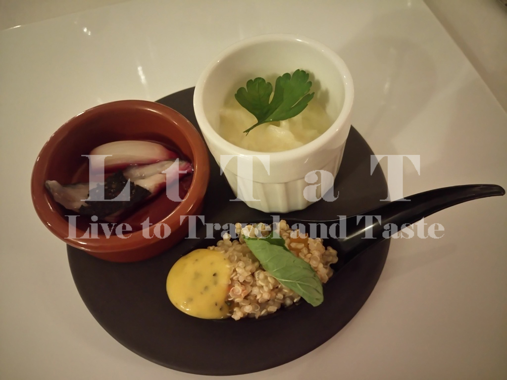 Amuse-bouchε No 2: ριζότο, σαλάτα με κινόα και μαριναρισμένο σκουμπρί με κρεμμύδι.