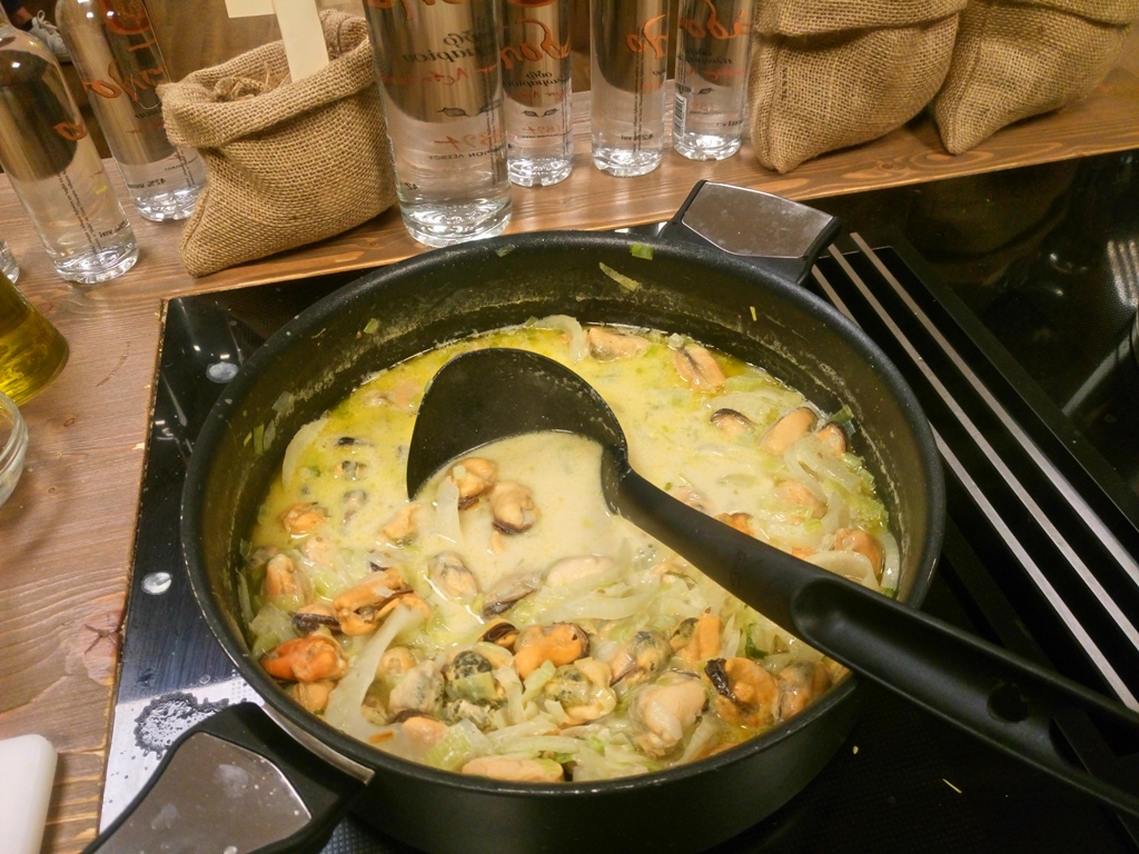 Η Ντίνα ξεκινά την προετοιμασία της πρώτης συνταγής: Μύδια με απαλή σάλτσα μουστάρδας, θυμάρι και τυρί κρέμα. Τονίζει για μια ακόμα φορά ότι όλα ξεκινούν από το ίδιο το εκάστοτε προϊόν, πίσω από το οποίο υπάρχει πάντα ο άνθρωπος! «Στη συνέχεια έρχομαι εγώ με τη μαγειρική μου» λέει με το πάθος που την χαρακτηρίζει και συνεχίζει: «Δεν θέλω αυτές να είναι δύο ακόμα ώρες από τη ζωή σας, αλλά δύο ώρες χαλαρές, ευχάριστες, ώρες που θα χαμογελάτε και θα περνάτε όμορφα!» Και προφανώς το έχει επιτύχει, δεδομένου ότι τα μαθήματά της είναι εξαιρετικά αγαπητά και γίνονται κυριολεκτικά ανάρπαστα! Θα σας παραδώσω με πολλή χαρά τις δύο αυτές συνταγές της Ντίνας Νικολάου, τις εμπνευσμένες από το ούζο «Άδολο», διότι είναι πρωτότυπες και δεν θα τις βρείτε κάπου αλλού.