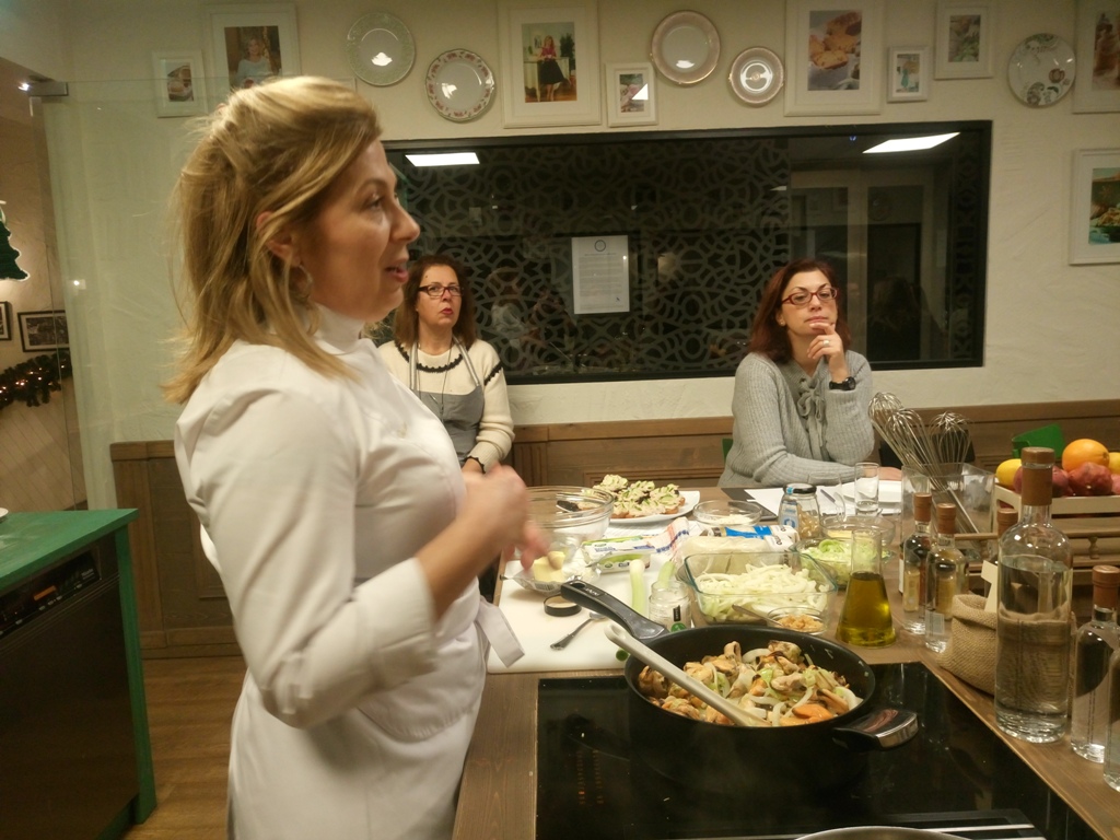 Για να πάρουμε όμως τα πράγματα από την αρχή όλα ξεκινούν από νωρίς το απόγευμα, όταν η Ντίνα και το δεξί της χέρι, η Μαίρη Μαζάνη, φροντίζουν να είναι όλα πανέτοιμα πριν καταφθάσουν οι πολυπληθείς συμμετέχοντες και αυτού του μαθήματος μαγειρικής. Tα πρώτα μεζεδάκια της βραδιάς ετοιμάζονται ήδη, γιατί στα μαθήματα της Ντίνας Νικολάου δεν μαθαίνουμε μόνο υπέροχες συνταγές, τις γευόμαστε κιόλας! Δηλαδή τι γευόμαστε, τρώμε κανονικότατα με την Ντίνα να μας υπενθυμίζει συνεχώς ότι υπάρχει περίσσευμα στις κατσαρόλες της, που θα είναι κρίμα να πάει χαμένο! Άντε τώρα εσύ να αντισταθείς!