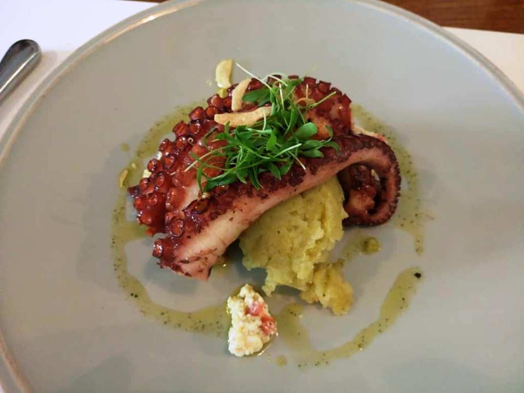 Ακολούθησαν τα κύρια πιάτα με πρώτο το ψητό χταπόδι σερβιρισμένο με ένα είδος πουρέ από ψωμί πατάτας και ντομάτας, λάδι βασιλικού, κόλιανδρο και τυρί cottage.