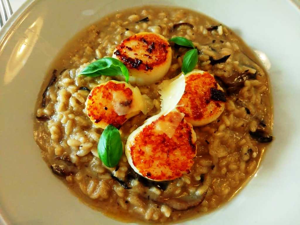 Τελευταίο κύριο πιάτο τα σωταρισμένα χτένια με risotto ρυζιού carnaroli και μανιτάρια portobello, γαρνιρισμένα με βασιλικό και φλούδες παρμεζάνας.