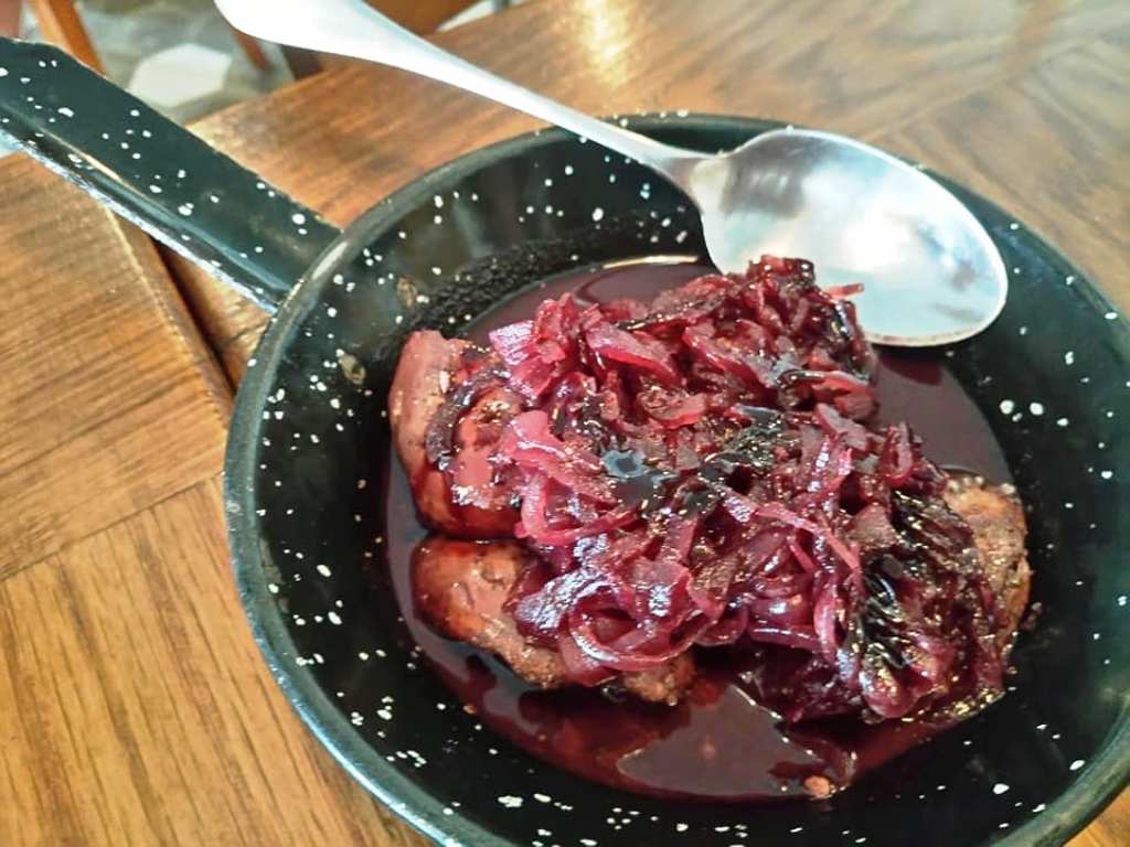 Το γεύμα μας ξεκίνησε, ως είθισται, με τα ορεκτικά και πρώτο-πρώτο αφίχθει το εξαιρετικό πιάτο με τα σωταρισμένα συκωτάκια πουλιών (μεγάλη αδυναμία μου!), «παντρεμένα» ιδανικά με μαρμελάδα κρεμμυδιών και reduction (τεχνική κατά την οποία η σάλτσα σιγοβράζει σε χαμηλή θερμοκρασία έως ότου μειωθεί) κρασιού Porto.