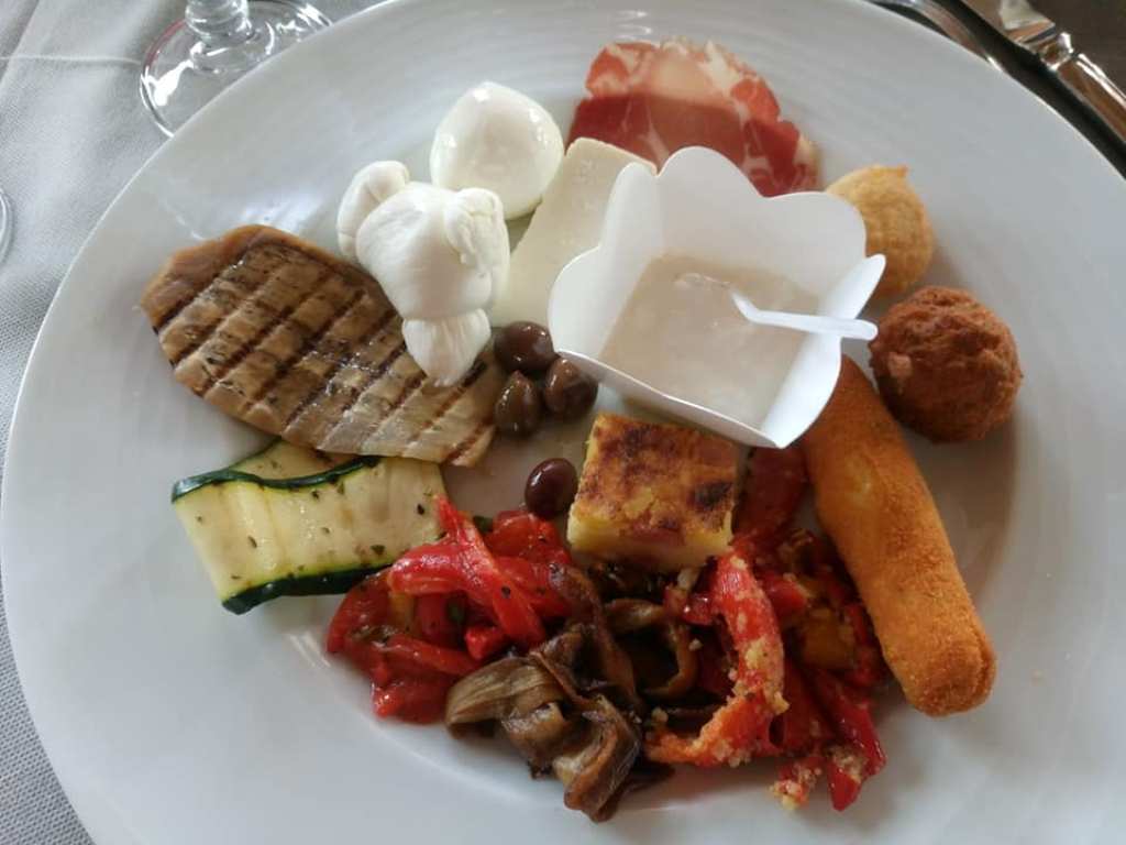 Antipasto misto (ανάμεικτα ορεκτικά), με λαχανικά, αλλαντικά και τυριά, μεταξύ των οποίων μοτσαρέλα και φρέσκο λευκό τυρί stracciatella di bufala, το οποίο παράγεται από γάλα βούβαλου και είναι ελαστικό σαν ζύμη. Το πιάτο περιέχει ακόμα pizza di patate (πατατόπιτα), polpette (κεφτεδάκια) και τυροκροκέτες,