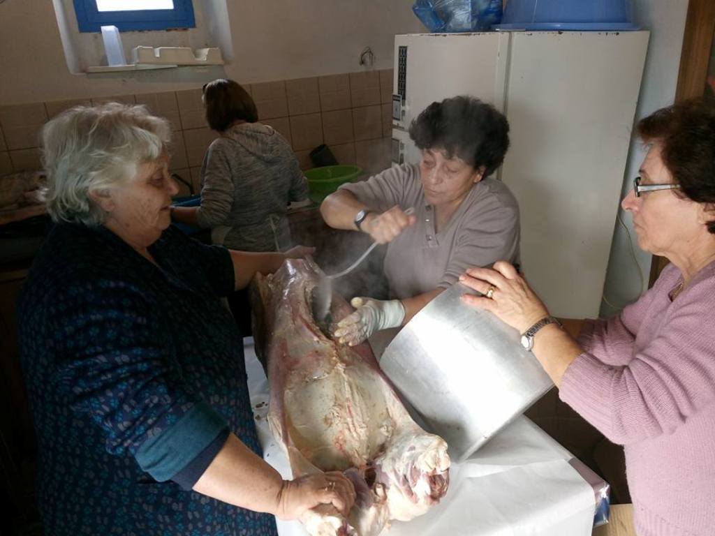 …όπου και ξεκινά αμέσως το τελικό στάδιο προετοιμασίας για τα γιαπράκια. Πρώτη από αριστερά η Φρόσω Σταυλά, σύζυγος του Επικεφαλής της Επιτροπής του Πανηγυριού Γιάννη Σταυλά. Επί δεκαετίες ολόκληρες και μέχρι πριν δύο μόλις χρόνια, η προετοιμασία των εδεσμάτων γινόταν στο σπίτι της! Ηρωίδα! Και είμαι βέβαιη πως κάθε νοικοκυρά θα συμφωνήσει με τον χαρακτηρισμό αυτό! Μαζί με την κυρία Φρόσω η Μαργαρίτα Νικολάκη και η Μαρία Πατηνιώτη.