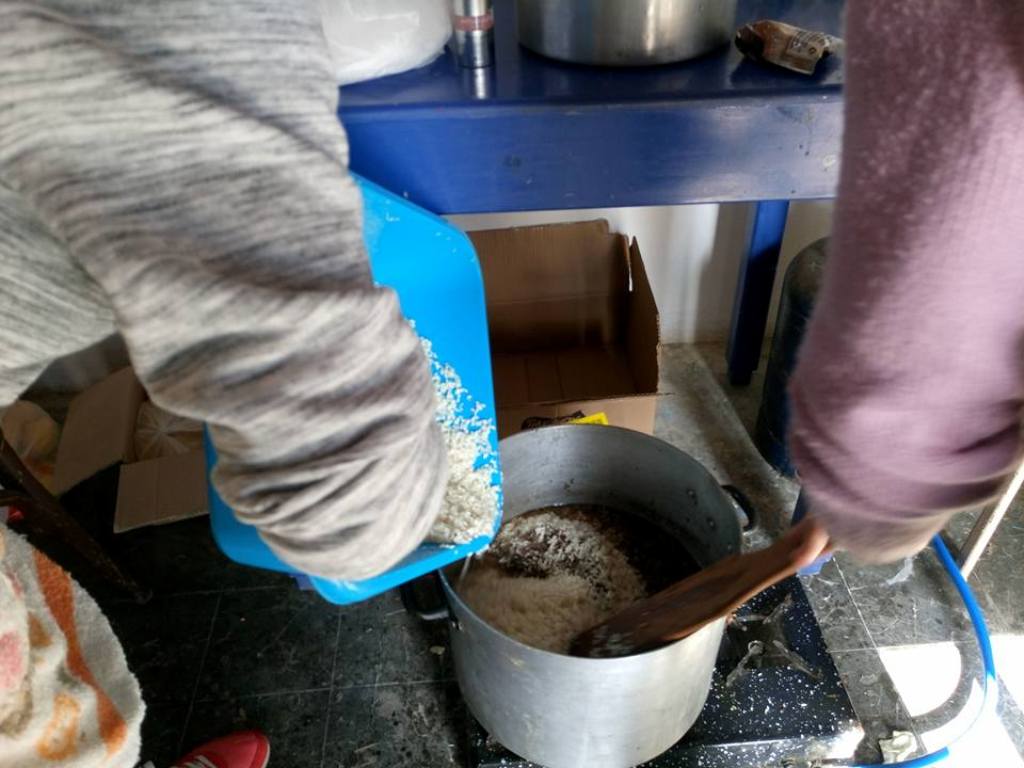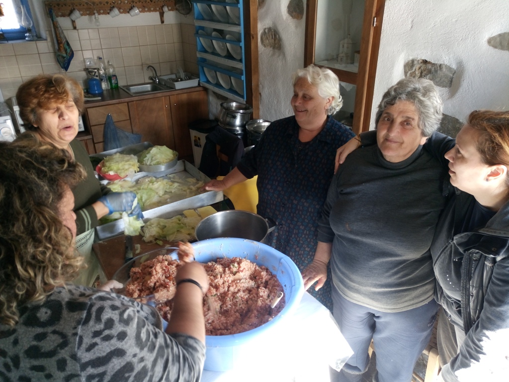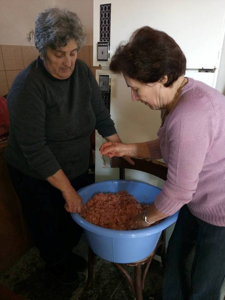 Η προετοιμασία της γέμισης για τα γιαπράκια βρίσκεται σε εξέλιξη. Ρύζι, κιμάς, βούτυρο, λίγη ντοματούλα, μαϊντανός, αλατοπίπερο και η εμπειρία των νοικοκυρών, αποτελούν τα συστατικά της! Επί το έργον η Νίνα Νικολάκη και η Ευαγγελία Καμπούρη.