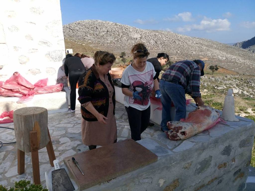 Στις αυλές έχουν κιόλας καταφθάσει τα αρνάκια, προσφορές των τσοπάνηδων του νησιού, όπως άλλωστε σε προσφορές όλων των κατοίκων στηρίζεται η συγκέντρωση των τεράστιων ποσοτήτων των υλικών, για τα παραδοσιακά εδέσματα του πανηγυριού.
