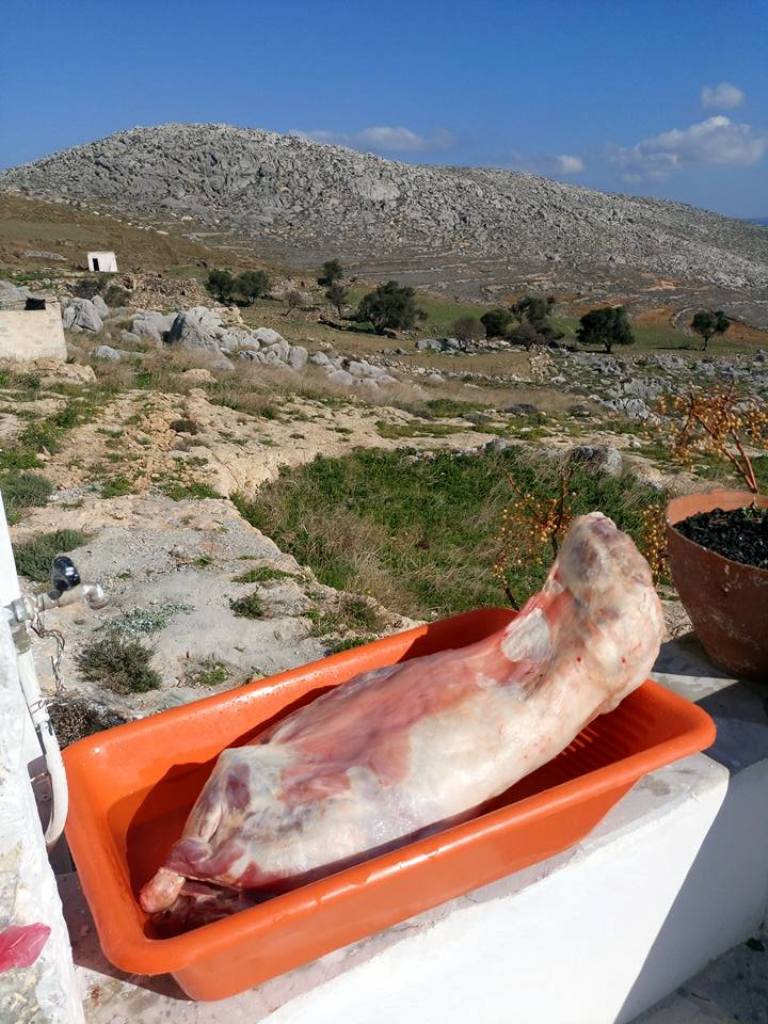 Στην αυλή το αρνάκι αφού πλύθηκε, καθαρίστηκε και πασπαλίστηκε η κοιλίτσα του με χοντρό θαλασσινό αλάτι, πιπέρι και μπαχάρι, ράβεται με επιδεξιότητα από την Ειρήνη Γιαννάρου-Καλούδη…