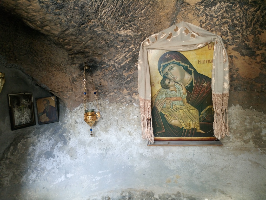 Μέρος του ναού αποτελεί σήμερα το σπήλαιο, στο οποίο βρέθηκε η θαυματουργή εικόνα από έναν τσοπάνη, ο οποίος και θεώρησε σωστό και πρέπον να την μεταφέρει στην Χώρα. Την επομένη ημέρα όμως έκπληκτος την αντίκρυσε και πάλι στο ίδιο σημείο, στην σπηλιά της.
