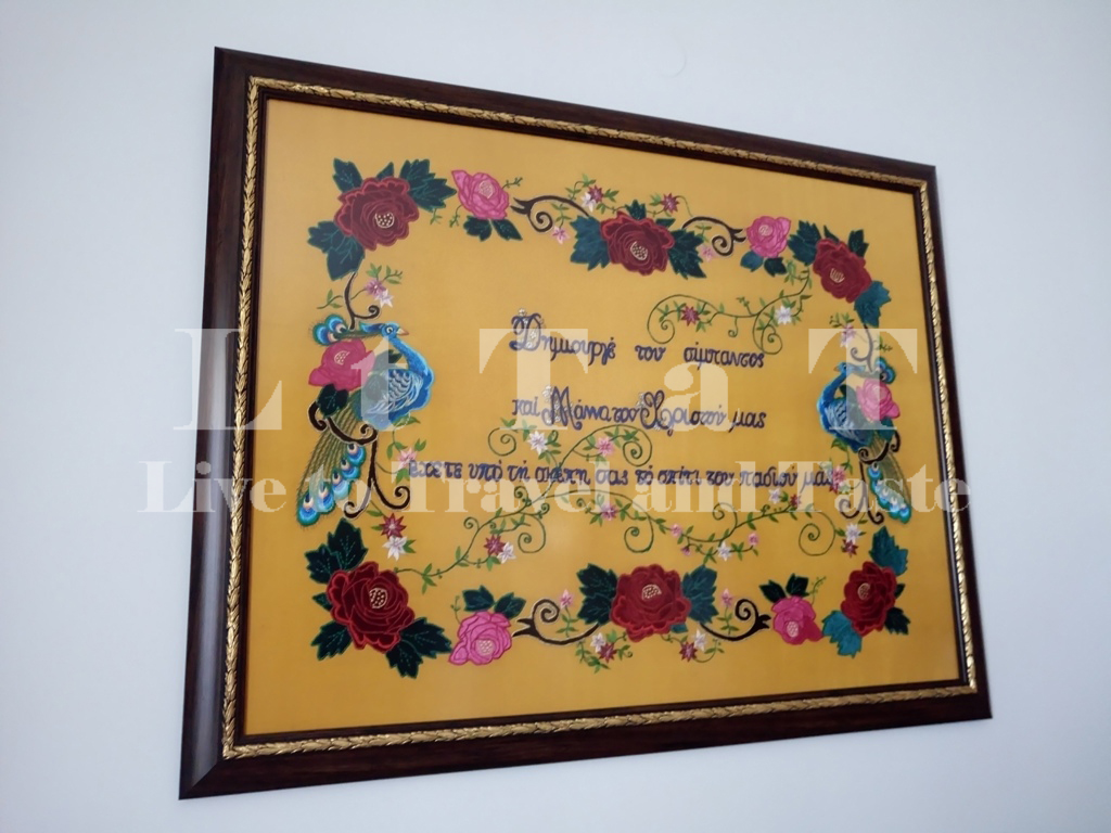 …ενώ στο συγκεκριμένο εργόχειρο η ίδια η μάνα όχι μόνο το σχεδίασε και το κέντησε, αλλά και συνέθεσε την μαντινάδα, αναπόσπαστο κομμάτι της ζωής και της ψυχής των Καρπαθίων γενικότερα.