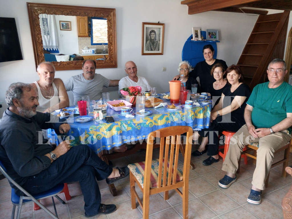 Μια όμορφη παρέα με υποδέχθηκε εδώ, με λουλούδια του Μαγιού και γλυκάκια του νησιού, με επικεφαλής φυσικά τον Ηλία Βασιλαρά (στο άκρο δεξιά του τραπεζιού). Τη γυναικοπαρέα μας αποτελούν η Σοφία Σακέλλη και η κόρη της Μαρία Κωνσταντίνου – Σακέλλη (αριστερά) και οι τρεις αδελφές Χαλκιά κατά το πατρώνυμο, δηλαδή η Ανθούλα Δημάρχου ιδιοκτήτρια και δεινή μαγείρισσα της «Φωλιάς», η Μαρία Διακολιού και η Ζωή Διακομιχάλη.