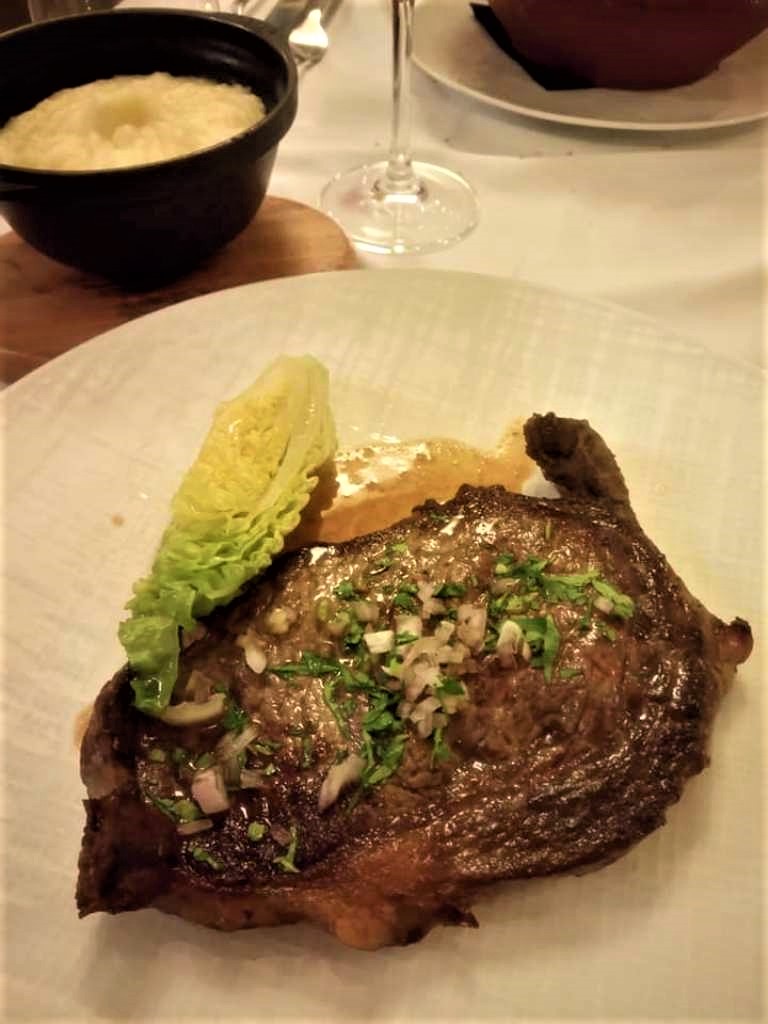 Βοδινό φιλέτο Limousin συνοδευμένο με πουρέ πατάτας, κρεμμυδάκι échalote και πράσινη σαλάτα.