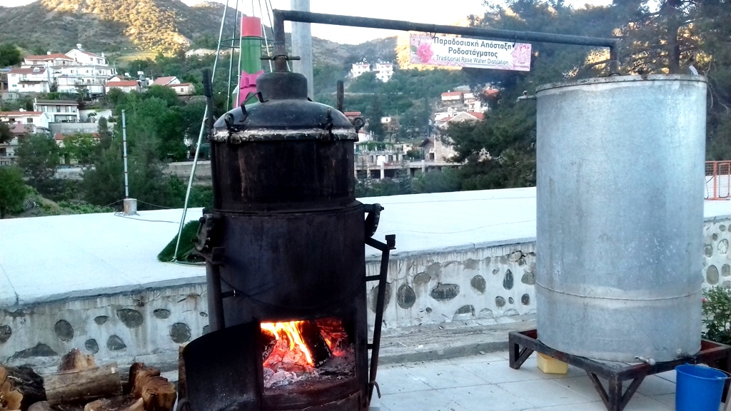«Για την παραγωγή ροδοστάγματος με τον παλιό παραδοσιακό τρόπο άναβαν φωτιά με τα ξύλα κάτω από το καζάνι και τα άφηναν εκεί να κοχλάσουν και να δημιουργηθεί ατμός. Στο πάνω μέρος του καζανιού υπήρχε ένα κενό, που το γέμιζαν με κρύο νερό, το οποίο όταν ζεσταινόταν το αντικαθιστούσαν (κάθε 70 με 75 περίπου λεπτά) με κρύο. Με αυτό τον τρόπο ο ατμός που δημιουργούνταν με την βράση των τριαντάφυλλων, έπαιρνε υγρή μορφή. Στο ενδιάμεσο υπήρχε μια μικρή εκροή, βρυσούλα, απ’ όπου έφευγε το υγρό κι έπεφτε σ’ ένα κανάτι ή άλλο δοχείο. Ο υγροποιημένος ατμός ήταν το ροδόσταγμα». Πηγή: Εικονικό Μουσείο Κυπριακών Τροφίμων και Διατροφής