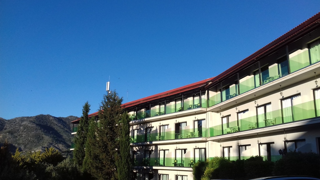 Το εντυπωσιακό Rodon Mount Hotel and Resort, με την πανοραμική θέα προς το χωριό.