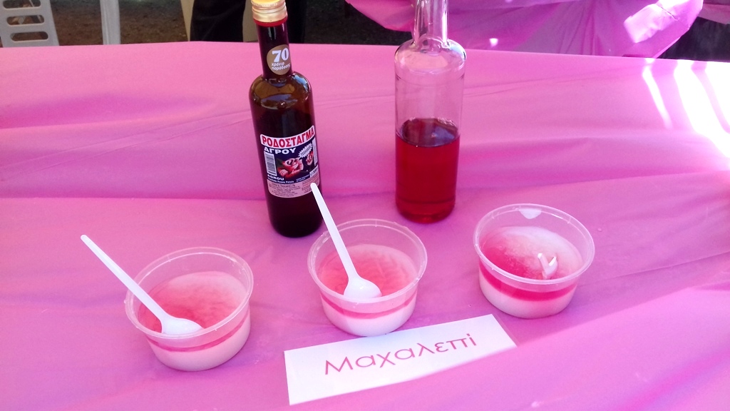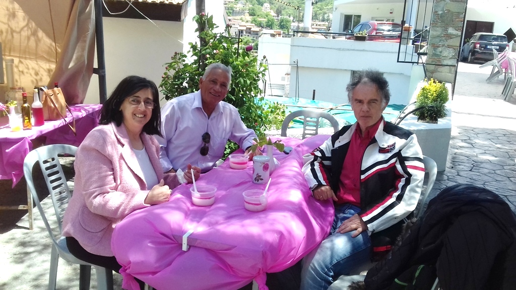 Απολαμβάνοντας μαχαλεπί με ευωδιαστό ροδόσταγμα Αγρού στην φιλόξενη αυλή του Εργοστασίου Τριανταφύλλου Chris N. Tsolakis L.T.D., με τον Βασίλη Τσούνη και τον Κυριάκο Αθρακιώτη (στο μέσον)…