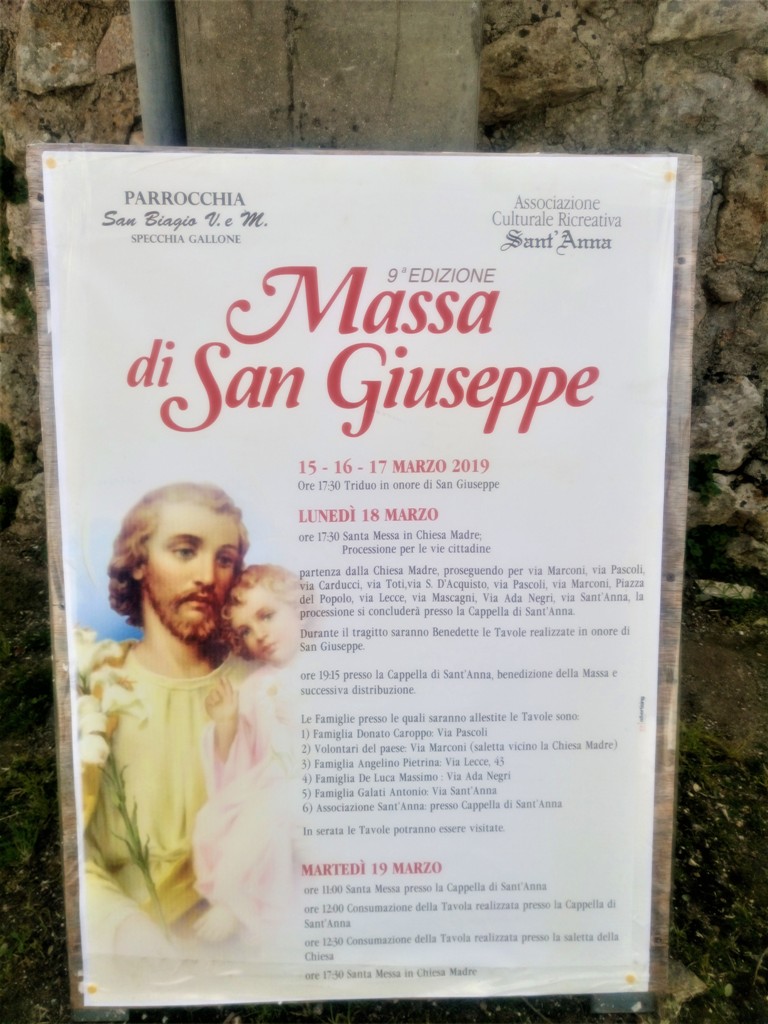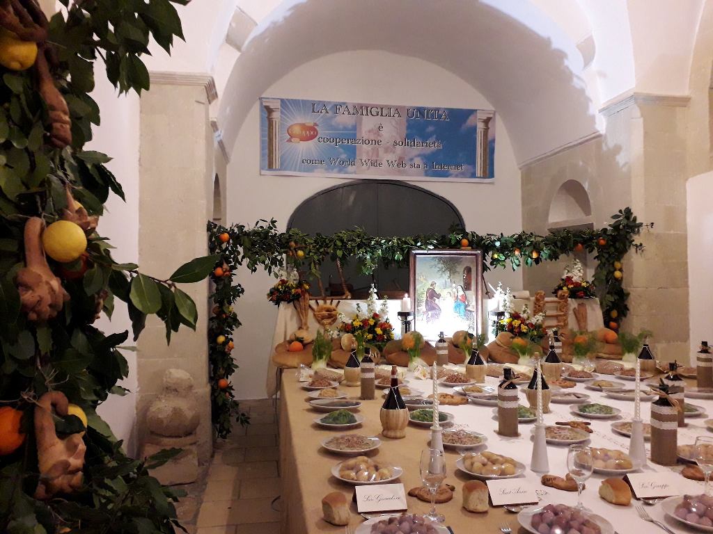 Πρώτη επίσκεψη της ημέρας στο Τραπέζι του Αγίου Ιωσήφ, που έχει στρωθεί στο κτήριο του παλιού σχολείου, με την φροντίδα της Κοινότητας του χωριού Cocumola (δείτε το σχετικό video στο κανάλι μας στο YouTube). Εδώ μας υποδέχεται το παλαιό έπιπλο «μάντια», ένα είδος ανοιγόμενου τραπεζιού-σεντουκιού, στο οποίο αποθήκευαν σιτάρι, αλεύρι ή και ψωμί στα χωριά της Jonica Salentina, δηλαδή στα χωριά του Salento, που βρέχονται από το Ιόνιο. Το ίδιο αυτό έπιπλο χρησίμευε και σαν Tavole για την γιορτή του San Giuseppe, όπως φαίνεται και στην φωτογραφία.