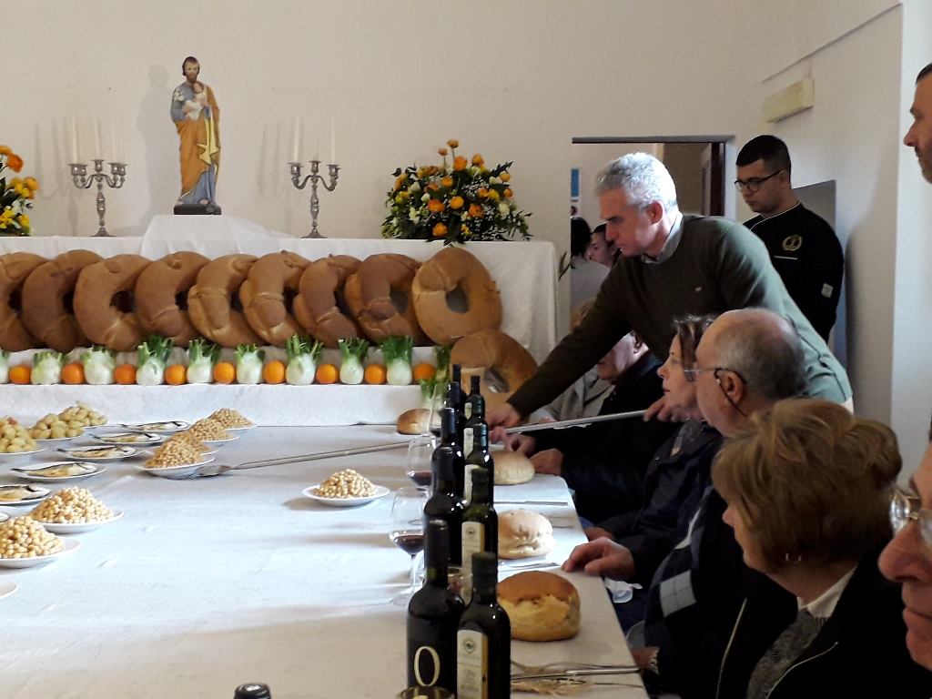 Ο Άγιος Ιωσήφ (San Giuseppe) χτυπάει τρεις φορές με το πηρούνι του το πιάτο με τηγανητά ψάρια, που βρίσκεται εμπρός του. Αυτομάτως τα υπόλοιπα μέλη της Αγίας Οικογένειας, η Μαρία και ο Ιησούς, αλλά και οι λοιποί 10 προσκεκλημένοι τους Άγιοι -μεταξύ των οποίων η Αγία Άννα, η Αγία Ελισάβετ, η Αγία Αγνή, ο Άγιος Φίλιππος, ο Άγιος Ζαχαρίας, ο Άγιος Ιωακείμ, Άγιος Ιωσήφ της Αριμαθαίας κ.άλ.-, σταματούν το φαγητό, προκειμένου να τους σερβιριστεί το επόμενο πιάτο του τελετουργικού γεύματος. Ο αριθμός 13 είναι ο μέγιστος για τους συνδαιτημόνες, προς ανάμνησιν του Μυστικού Δείπνου -o ελάχιστος αριθμός συμμετεχόντων είναι τρεις, o Άγιος Ιωσήφ, η Μαρία και ο Ιησούς-, αλλά πάντοτε σε ζευγάρια Αγίων και σε μονούς αριθμούς, ενώ το 13 σηματοδοτεί επίσης την ανώτερη ποσότητα διαφορετικών πιάτων, που θα γευθούν οι προσκεκλημενοι στο «Τραπέζι του Αγίου Ιωσήφ» (Tavola di San Giuseppe). Στο Τραπέζι μεταξύ άλλων σερβίρονται -εκτός από τα τηγανητά ψάρια που θυμίζουν τον Ιησού-, ρεβύθια, που το σχήμα τους ομοιάζει με τον νάρκισσο, το λουλούδι του Αγίου Ιωσήφ, μπρόκολο που παραπέμπει στο ανθισμένο ραβδί του, βολβοί που συμβολίζουν το πέρασμα από το χειμώνα στην άνοιξη, τηγανητό φινόκιο, το σχήμα των φύλλων του οποίου παραπέμπει στο σχήμα του «πωπού» του βρέφους Ιησού, ολοστρόγγυλα pitule, σαν μικρά λουκουμαδάκια, που θυμίζουν τις τρεις μπάλες-σύμβολο της Αγίας Τριάδας, ncartiddati ή cartellate -κάτι σαν τα δικά μας ξεροτήγανα σε σχήμα τριαντάφυλλου-, που μοιάζουν με τις φασκιές των μωρών, γι’ αυτό άλλωστε αποτελούν κατ’εξοχήν χριστουγεννιάτικο γλύκισμα. Απουσιάζουν από το Τραπέζι αυτό παντελώς το κρέας, τα αυγά και τα γαλακτοκομικά, ενώ κυριαρχούν τα λαχανικά και τα ζυμαρικά.
