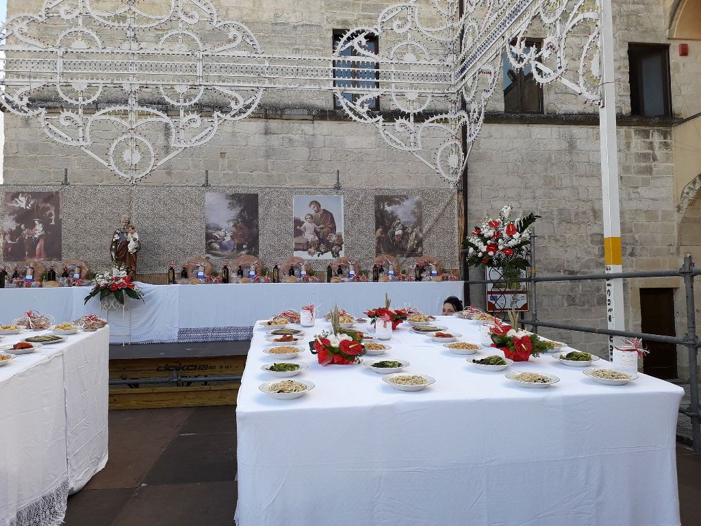 Το πλέον χαρακτηριστικό γνώρισμα αυτών των μεγάλων «Τραπεζιών του Αγίου Ιωσήφ», είναι τα τεράστια στρογγυλά ψωμιά σε σχήμα αγκαλιάς, τα ψωμιά του San Giuseppe, ένα είδος γιγαντιαίων λουκουμάδων, θα μπορούσαμε να πούμε, τα οποία ζυγίζουν 3 έως και 5 κιλά έκαστο και χρειάζονται περίπου 3 ώρες ψήσιμο (το πεντόκιλο). Κάθε ψωμί φέρει το σύμβολο του Αγίου στον οποίο αφιερώνεται, μπαστουνάκι για τον Άγιο Ιωσήφ, ροζάριο για την Madonna, σκάλα για το Άγιο Ζαχαρία κ.ο.κ. Το ομοίωμα του Αγίου Ιωσήφ ή της Αγίας Οικογένειας δεσπόζει στο κέντρο των Τραπεζιών αυτών, τα οποία είναι στρωμένα με τα ωραιότερα κεντήματα και τις πιο λεπτοδουλεμένες δαντέλες, συχνά χειροποίητα, με τις πιο φίνες πορσελάνες και τα ακριβότερα ασημικά της κάθε νοικοκυράς. Κάθε πιστός, που επιθυμεί να εκφράσει την ευγνωμοσύνη του προς τον Άγιο Ιωσήφ ή να ζητήσει συγχώρεση, μπορεί να προετοιμάσει και να στολίσει στο σπίτι του το δικό του Τραπέζι, με τις προετοιμασίες να ξεκινούν μία εβδομάδα νωρίτερα. Την παραμονή της εορτής, στις 18 Μαρτίου, όλα αυτά τα σπίτια είναι ανοικτά και υποδέχονται τον κόσμο που τα επισκέπτεται, προκειμένου να κεραστεί και να ευχηθεί στους οικοδεσπότες. Στο επίκεντρο της προσοχής όλων το μεγάλο Τραπέζι στο σαλόνι της κατοικίας, γεμάτο με τα παραδοσιακά φαγητά, στολισμένο με φινόκιο και πορτοκάλια, με μπουκάλια λάδι και κρασί, όσπρια και ζυμαρικά και ό,τι άλλο επιλέξει η δημιουργική φαντασία των πιστών που το προετοίμασαν, πάντοτε με βάση τα παραδοσιακά προϊόντα της περιοχής. Ο Δήμος φροντίζει για την δημιουργία ενός χάρτη με τα σπίτια που είναι ανοικτά και δέχονται κόσμο, έτσι ώστε κάθε επισκέπτης να μπορεί να βιώσει στο μέγιστο την εμπειρία αυτή.