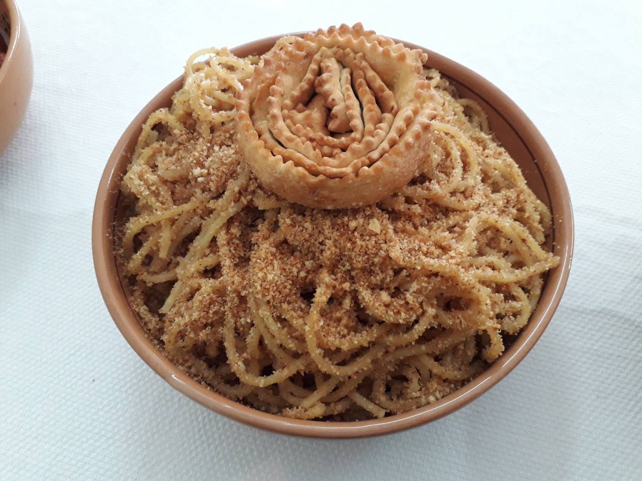 Σπαγγέτι με μέλι και τηγανητά ψίχουλα. Στην κορυφή το χριστουγεννιάτικο γλυκό ncartiddati ή cartellate -κάτι σαν τα δικά μας ξεροτήγανα σε σχήμα τριαντάφυλλου-, που μοιάζουν με τις φασκιές των μωρών.