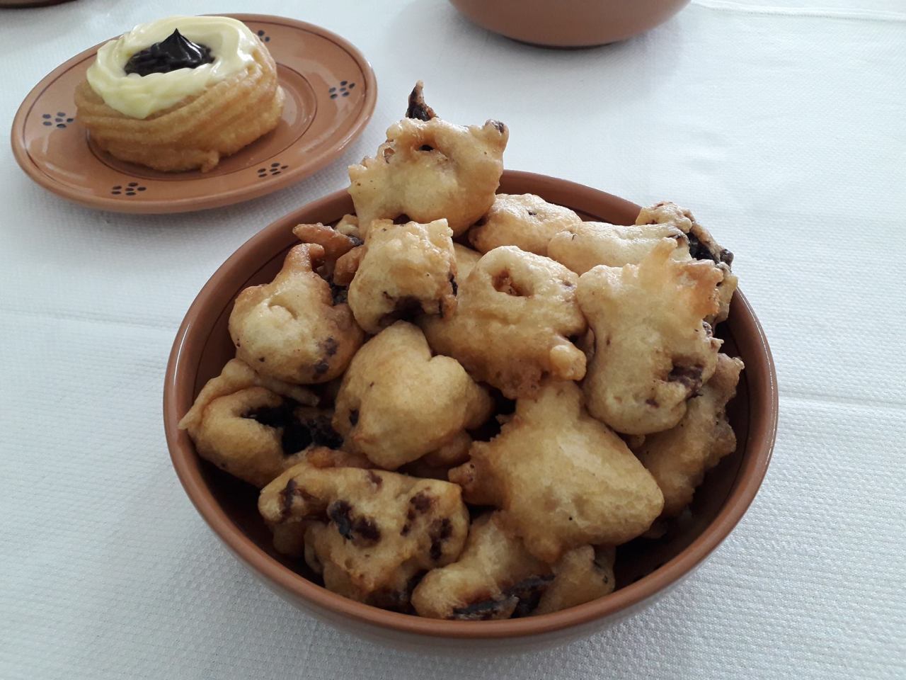 Τα στρόγγυλα pitule, σαν μικρά λουκουμαδάκια, που θυμίζουν τις τρεις μπάλες-σύμβολο της Αγίας Τριάδας. Πίσω το γλυκάκι zeppole, γεμιστό με κρέμα ζαχαροπλαστικής, αποτελεί ένα ακόμα σύμβολο της γιορτής του Αγίου Ιωσήφ, η οποία στην Ιταλία συμπίπτει με την Γιορτή του Πατέρα.