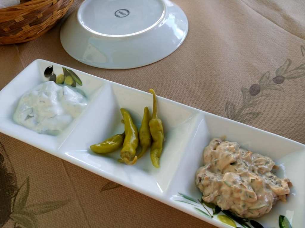 Τα amuse buche -τα πρώτα μεζεδάκια που φθάνουν στο τραπέζι σου, πριν καλά καλά προλάβεις να ολοκληρώσεις την παραγγελία σου- έφθασαν! Μαγιονέζα με λιαστή ντομάτα, πιπερίτσες και γιαούρτι με τουρσί.