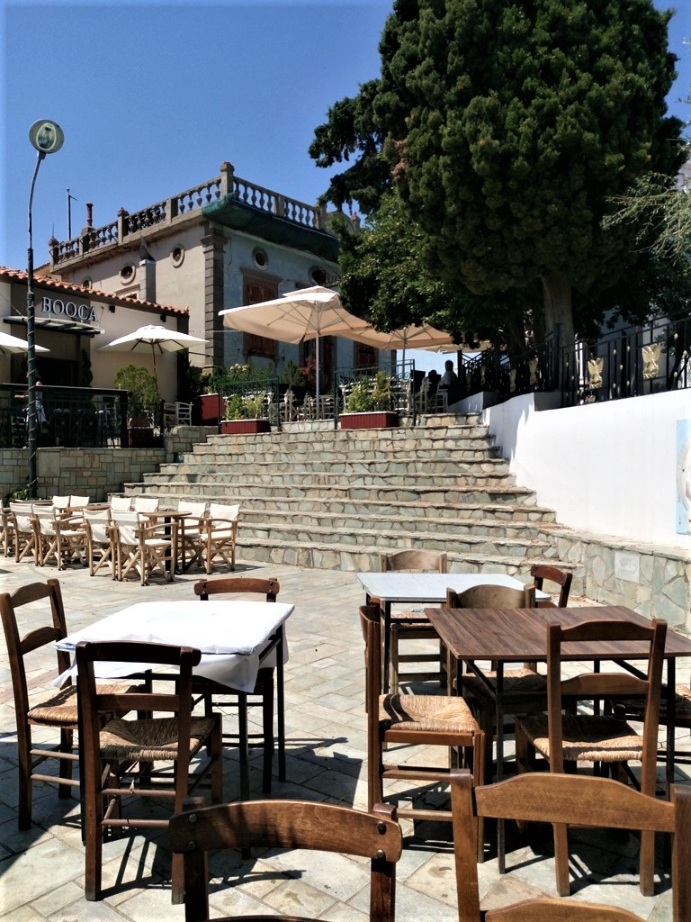 Tο Ηρώον του Μούδρου. Υπό την «επίβλεψή» του στέκεται το «Pezoula Cafe», ένα από τα κορυφαία του είδους του στο νησί.