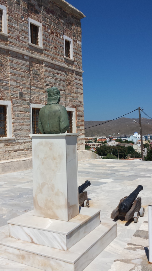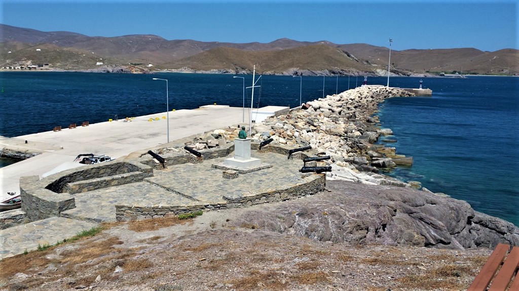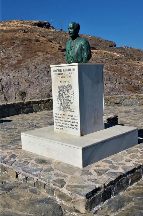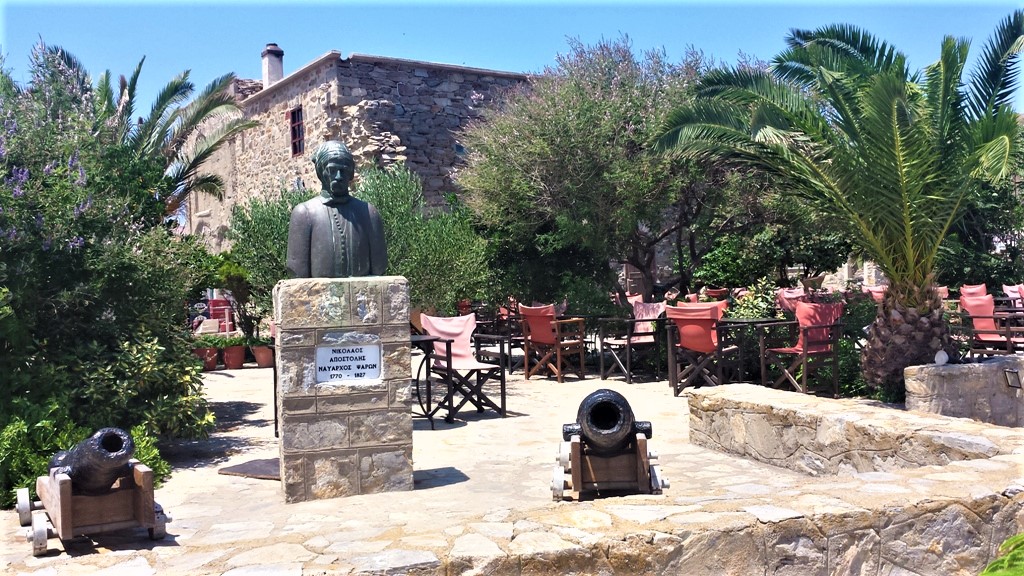 Ακριβώς απέναντι, στη νότια πλευρά του λιμανιού των Ψαρών, στέκονται τα κανόνια που συντροφεύουν την προτομή του πυρπολητή Δημήτρη Παπανικολή (1790 – 1855)…