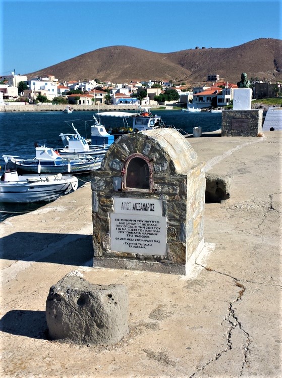 Μια τελευταία βόλτα στο λιμάνι των Ψαρών μας φέρνει μπροστά στο εικονοστάσι του Αγίου Αλεξάνδρου, που στήθηκε εδώ στην μνήμη του ναυτικού Αλέξανδρου Πετράλη, ο οποίος θυσιάστηκε για να σώσει την ζωή των ναυτικών του «Παναγία Ψαριανή», στις 15/2/2005. Πίσω του, στην άκρη του μώλου, η προτομή ενός ακόμα άξιου τέκνου των Ψαρών, του εθνικού ευεργέτη Ιωάννη Βαρβάκη, αφιέρωμα του Συλλόγου Αποφοίτων του Βαρβακείου.