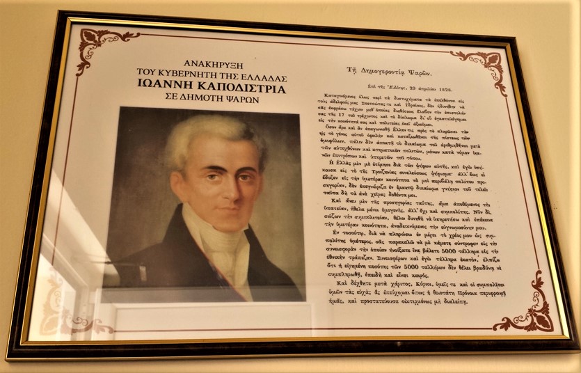 Στις 20 Απριλίου 1828 η Δημογεροντία Ψαρών ανακήρυξε τον Ιωάννη Καποδίστρια σε Δημότη Ψαρών.
