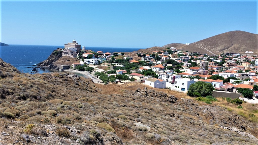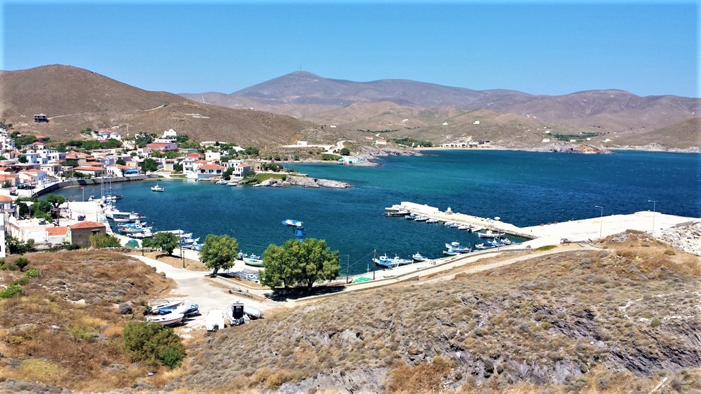 Πανοραμική άποψη της γραφικής πολιτειούλας των Ψαρών και του λιμανιού από το ύψωμα της Μαύρης Ράχης.