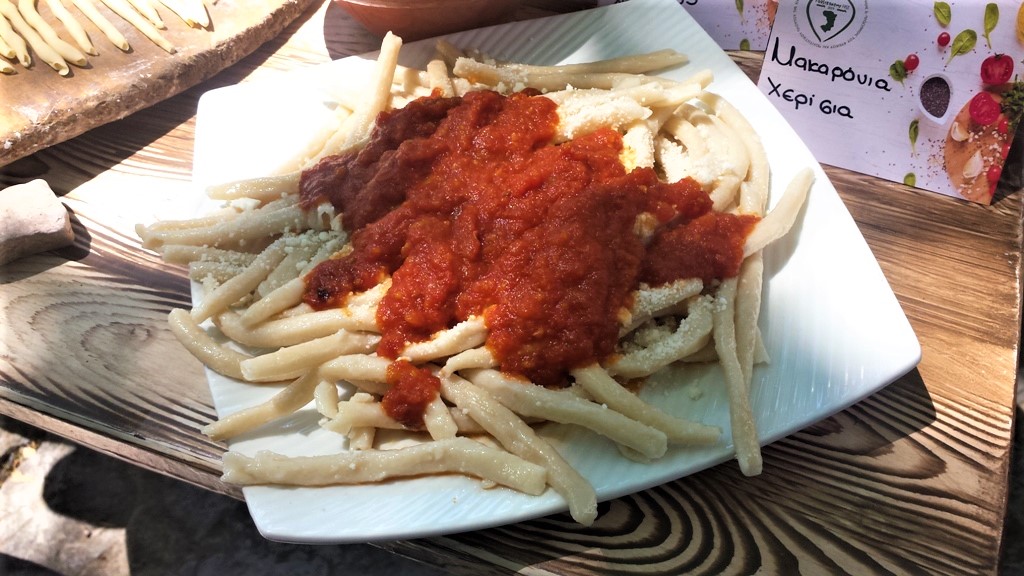 Χερίσια μακαρόνια, τα πιο διάσημα ζυμαρικά της Χίου, με καταγωγή από τα βορειόχωρα του νησιού. Τα χερίσια μακαρόνια πλάθονται γύρω από ένα σπάρτο. Επειδή είναι δύσκολο έως αδύνατον να βρεθεί σπάρτο στις μεγαλουπόλεις, η εργασία αυτή μπορεί να γίνει και με καλαμάκι για σουβλάκι. Όταν το σπάρτο ή το καλαμάκι τραβηχτεί απομένει το μακαρόνι, ένας λεπτός κύλινδρος με τρύπα στη μέση και μάκρος 12-15 εκατοστά.