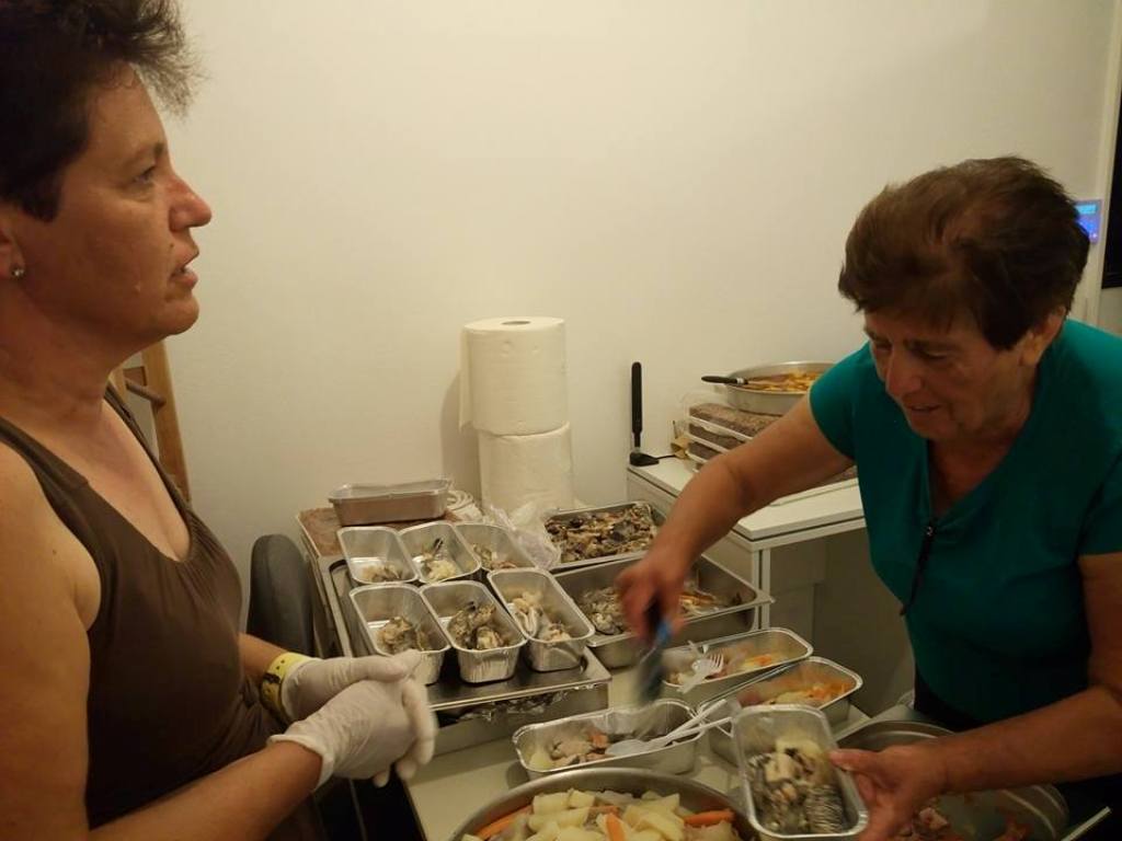 …ενώ πλήθος εθελοντών, με επικεφαλής την Αντιδήμαρχο -και νεοεκλεγείσα Δήμαρχο Φολεγάνδρου– Ευθαλία Παπαδοπούλου (πρώτη δεξιά), αναλαμβάνει το σερβίρισμα της πεντανόστιμης κακαβιάς και των άλλων τοπικών εδεσμάτων.
