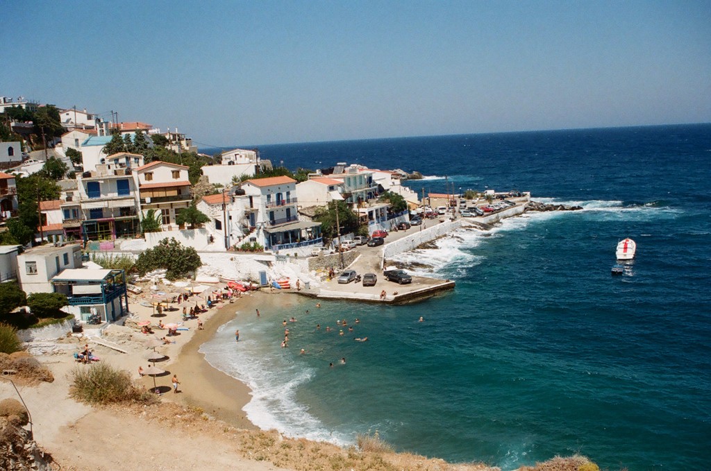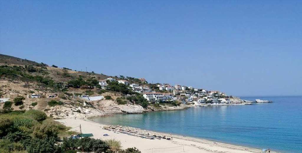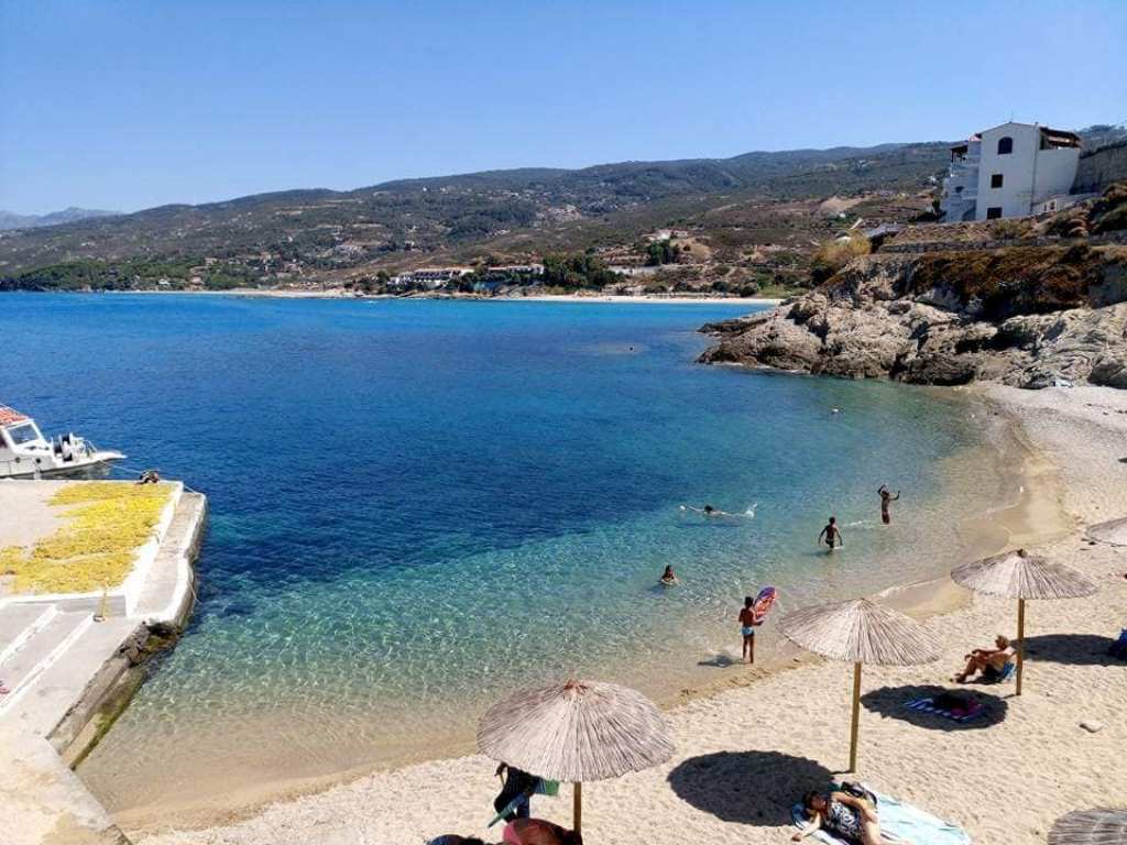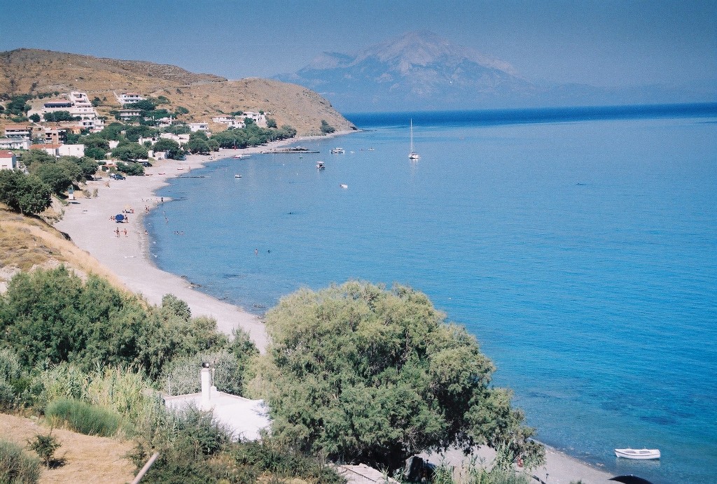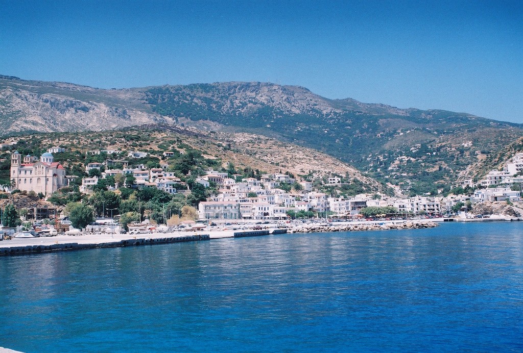 …με την μεγάλη παραλία του και τα πάμπολλα καταλύματα και εστιατόριά του. Πίσω η Σάμος.