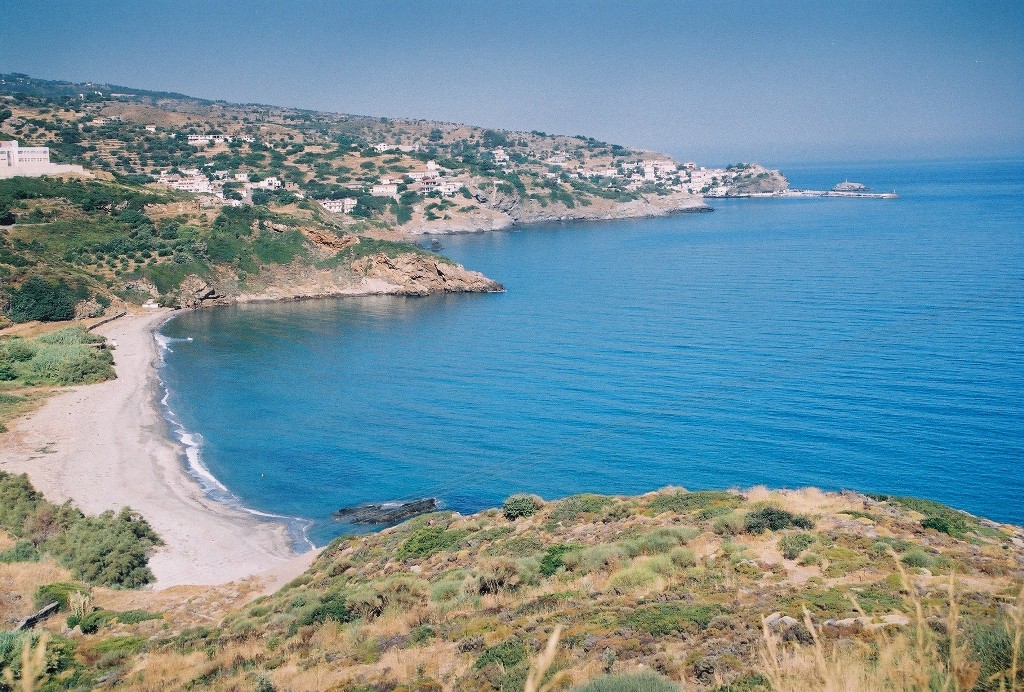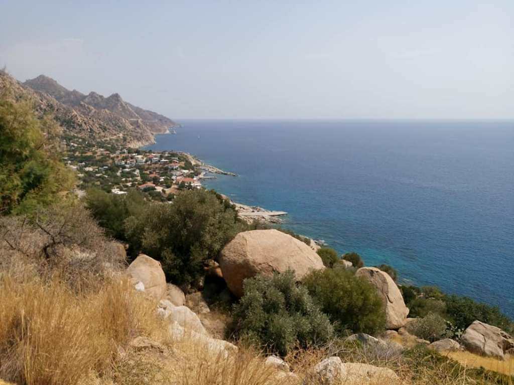 …και εδώ η μικροσκοπική ομώνυμη παραλία στα πόδια του οικισμού του Αρμενιστή. Στο βάθος οι χρυσές αμμουδιές Μεσακτή και Γιαλισκάρι.