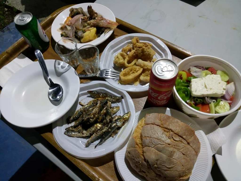 Εδώ ο δίσκος με τι άλλο, ψαρολιχουδιές, που περιλαμβάνουν ψαράκια ψητά, καλαμαράκια τηγανητά, βραστό ψάρι και φυσικά σαλάτα, ψωμάκι και ποτά!